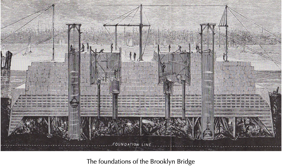 Construction of the bridge took place with dozens of unforeseen events, first of all the death of the inventor and chief engineer John Roebling in 1869, due to a tetanus infection. He was succeeded by his son Washington, now thirty years old, who was forced into a wheelchair some time later. The incident in which Roebling Jr. was involved affected many workers before him, and slowed down the construction of the bridge. It was decompression sickness, one of the many risks that occurred when in the first phase of the project the foundations had to be laid for the bridge at the bottom of the river.